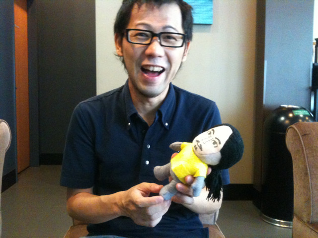 今朝は4時頃に寝たんですが8時には起きまして、近所で『都心に住む』の取材を受けましたよ。インタビュアーは久しぶりに会った藤井隆史さんです。ミニくま人形と一緒にパチリ。