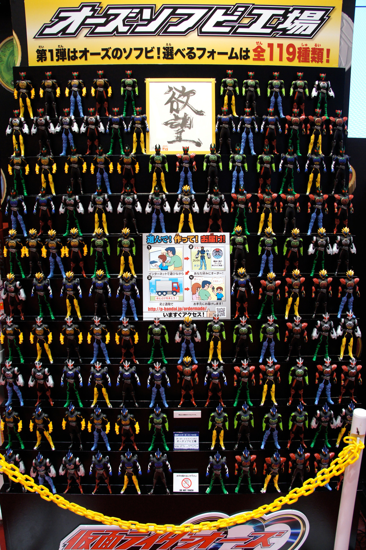 そしてお待ちかねのオーダーメイドバンダイ オーズソフビ工場の全119体ラインナップですよ。119体購入者のみに贈られる特典・鴻上会長の「欲望」色紙が神々しい。※クリックで拡大します。