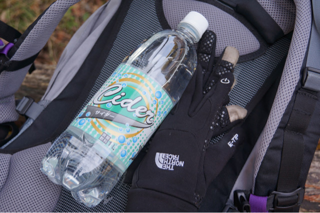 今日のドリンクは行動食と一体になった100円ショップの1リットルサイダー。