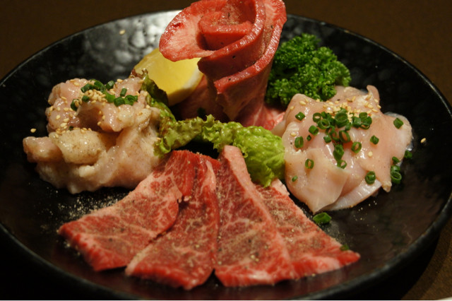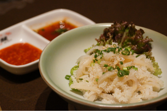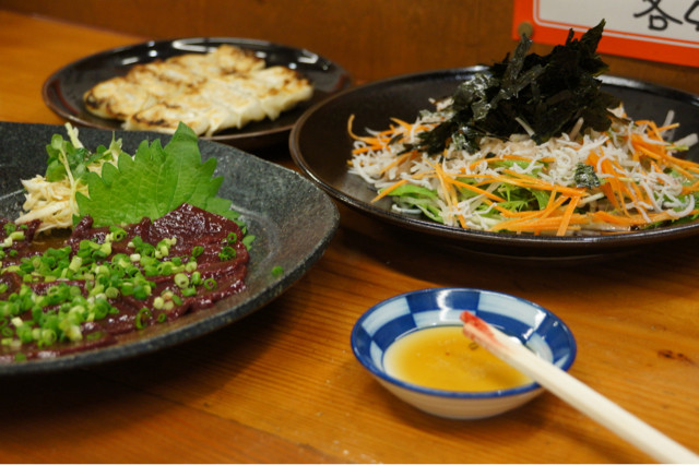 オススメというセンマイ刺。分厚いチヂミも人気だそう。落ち着いた店内で女性客も多し。