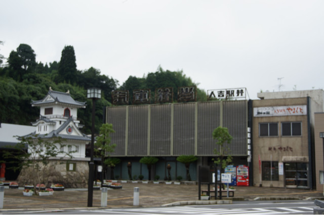 九州自動車道で豪雨に見舞われ撥水剤の甲斐なくびしょ濡れ。人吉駅。