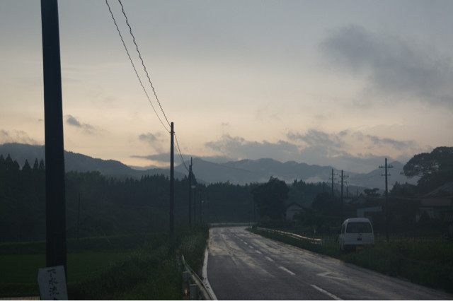 峠をふたつ越え椎葉を抜けて振り返ると綺麗な夕陽。こちら側は雨だと言うのに。