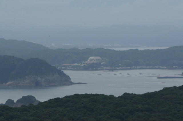 米の山展望台から眺めるかどがわ温泉。手前が乙島。ぼくの部屋名。