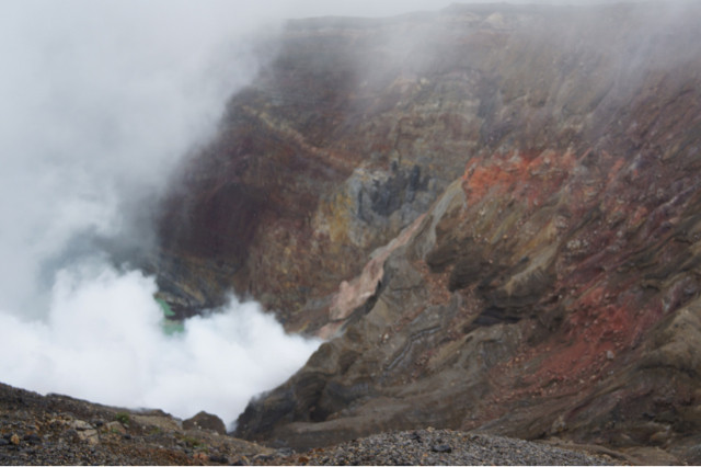 いよいよ阿蘇山火口へ。突風が吹いてくる。